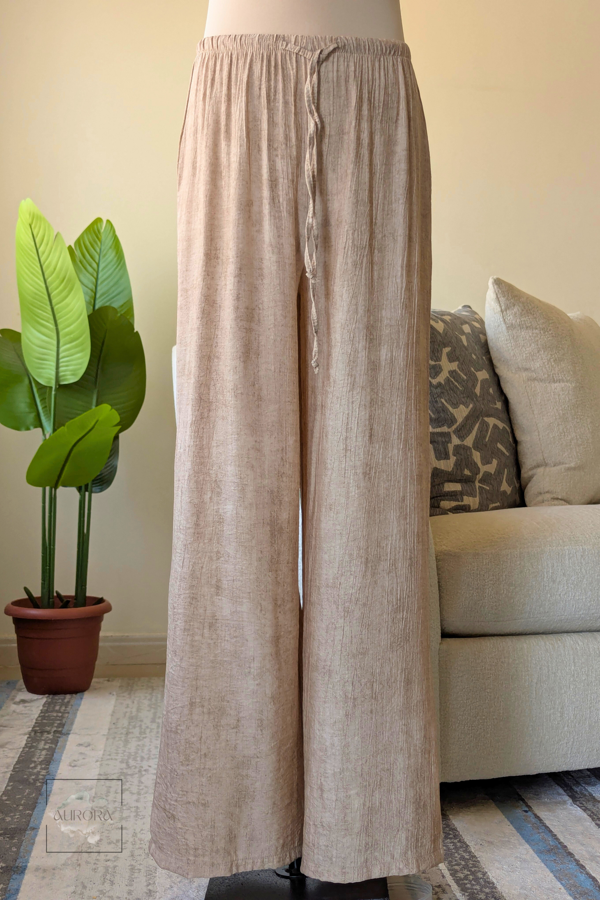 Straight-fit pants with a slightly wide cut, featuring an elastic waist and adjustable tie for the perfect fit.